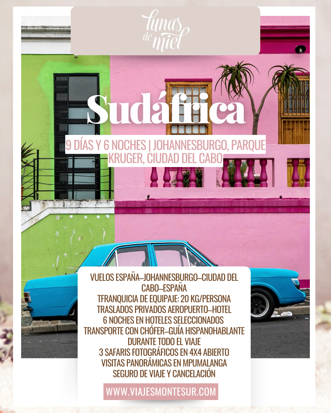 La luna de miel en Sudáfrica ofrece un itinerario organizado que combina safaris en reserva privada y una estancia en Ciudad del Cabo. El programa cuenta con salidas los domingos e incluye una noche en Johannesburgo, dos noches en la zona del Parque Kruger dentro de una reserva privada y tres noches en Ciudad del Cabo. La categoría hotelera es a elección del cliente y el régimen alimenticio se ajusta a lo indicado en el programa.