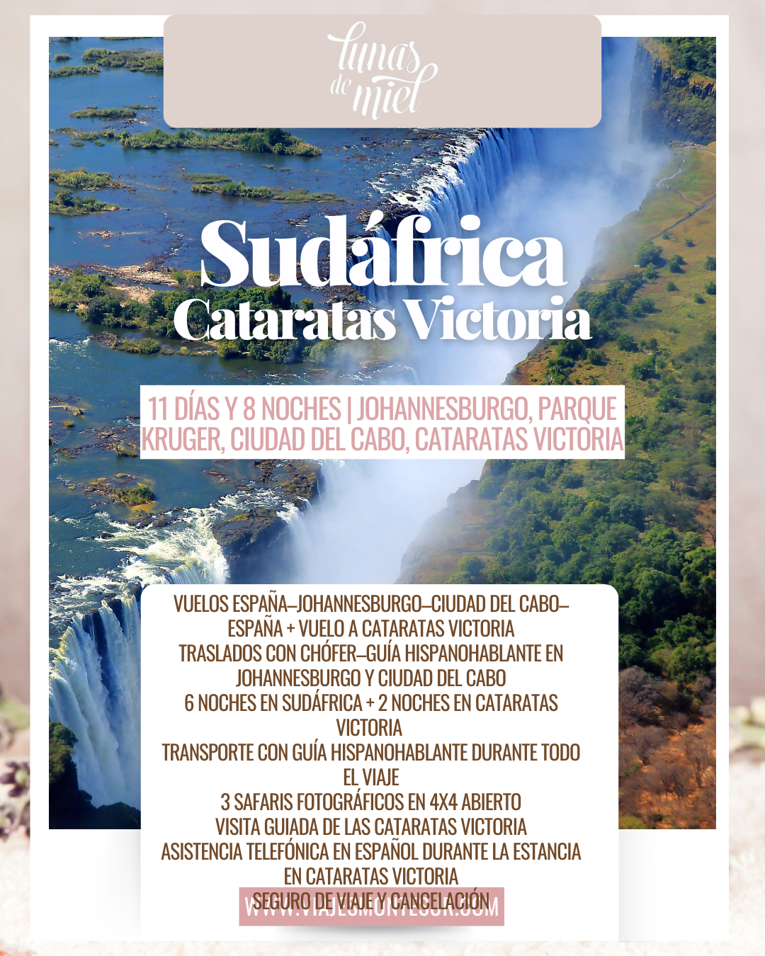 La luna de miel en Sudáfrica y Cataratas Victoria ofrece un itinerario organizado que combina safaris en reserva privada, visitas guiadas y una estancia final en uno de los entornos naturales más reconocidos del continente. El programa cuenta con salidas los domingos e incluye una noche en Johannesburgo, dos noches en la zona del Parque Kruger dentro de una reserva privada, tres noches en Ciudad del Cabo y dos noches en Cataratas Victoria. La categoría hotelera es a elección del cliente y el régimen alimenticio se ajusta a lo indicado en el programa.
