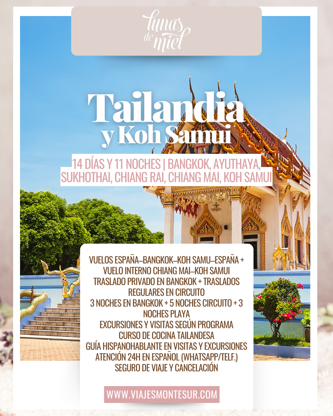 La luna de miel en Tailandia y Koh Samui combina una estancia inicial en Bangkok, un circuito organizado por el norte del país y unos días de descanso en playa. El programa incluye tres noches en Bangkok, una noche en Ayutthaya, una noche en Sukhothai, una noche en Chiang Rai, dos noches en Chiang Mai y tres noches ampliables en Koh Samui. La categoría hotelera es a elección del cliente y el régimen alimenticio se ajusta a lo indicado en el programa, con alojamiento y desayuno en Bangkok, media pensión durante el circuito y régimen libre en playa.