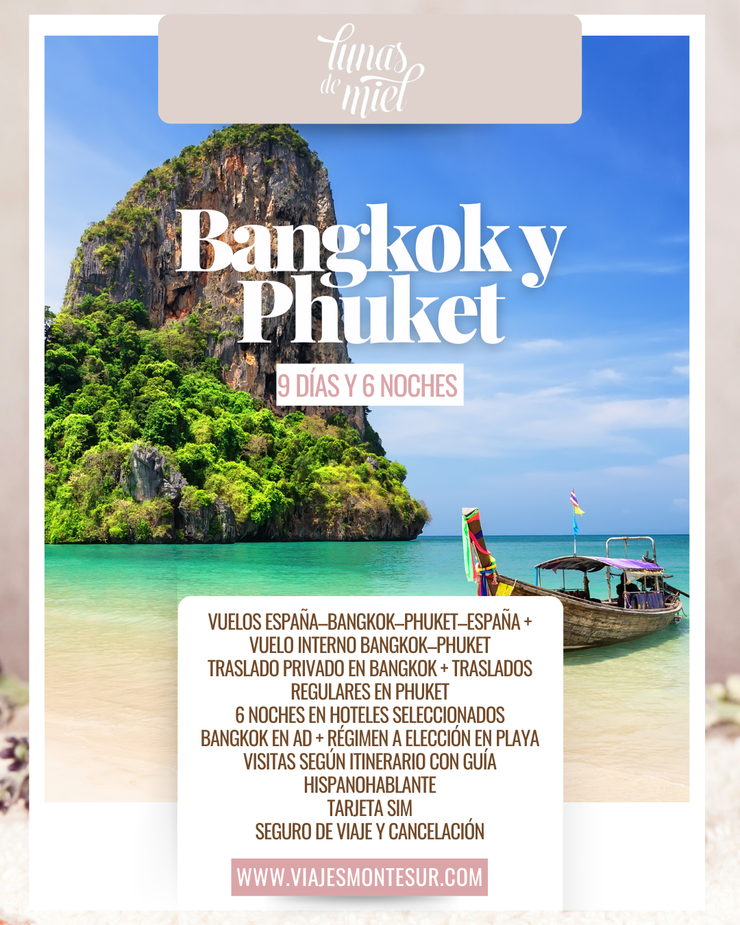 Este programa está diseñado para quienes buscan una luna de miel estructurada, con servicios incluidos y la flexibilidad de elegir categoría hotelera y régimen en playa. La combinación de visitas guiadas, traslados organizados y días libres en Phuket permite disfrutar de un viaje equilibrado y cómodo.