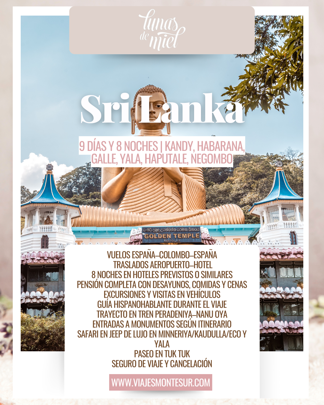 La luna de miel en Sri Lanka ofrece un circuito organizado en pensión completa que combina naturaleza, patrimonio cultural y experiencias locales. El programa cuenta con salidas todos los martes e incluye ocho noches de alojamiento en hoteles seleccionados o similares, distribuidos en Kandy, Habarana, Galle, Yala, Haputale o Ella (según fecha) y Negombo. La categoría hotelera es única y el itinerario está diseñado para cubrir los principales puntos de interés del país.