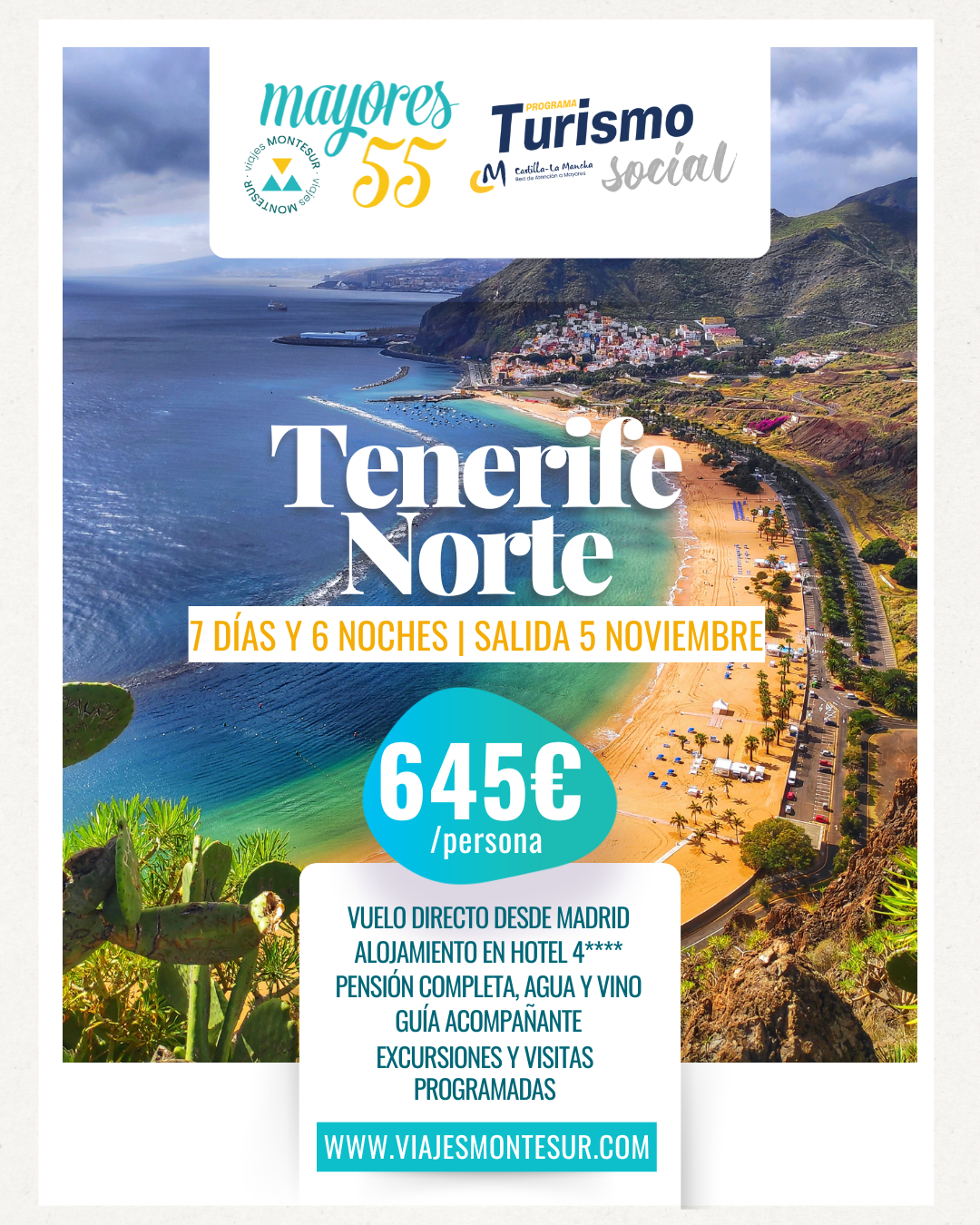 La oferta incluye 7 días y 6 noches con salida garantizada desde Castilla-La Mancha a Tenerife en fechas programadas: 5 de noviembre de 2025.