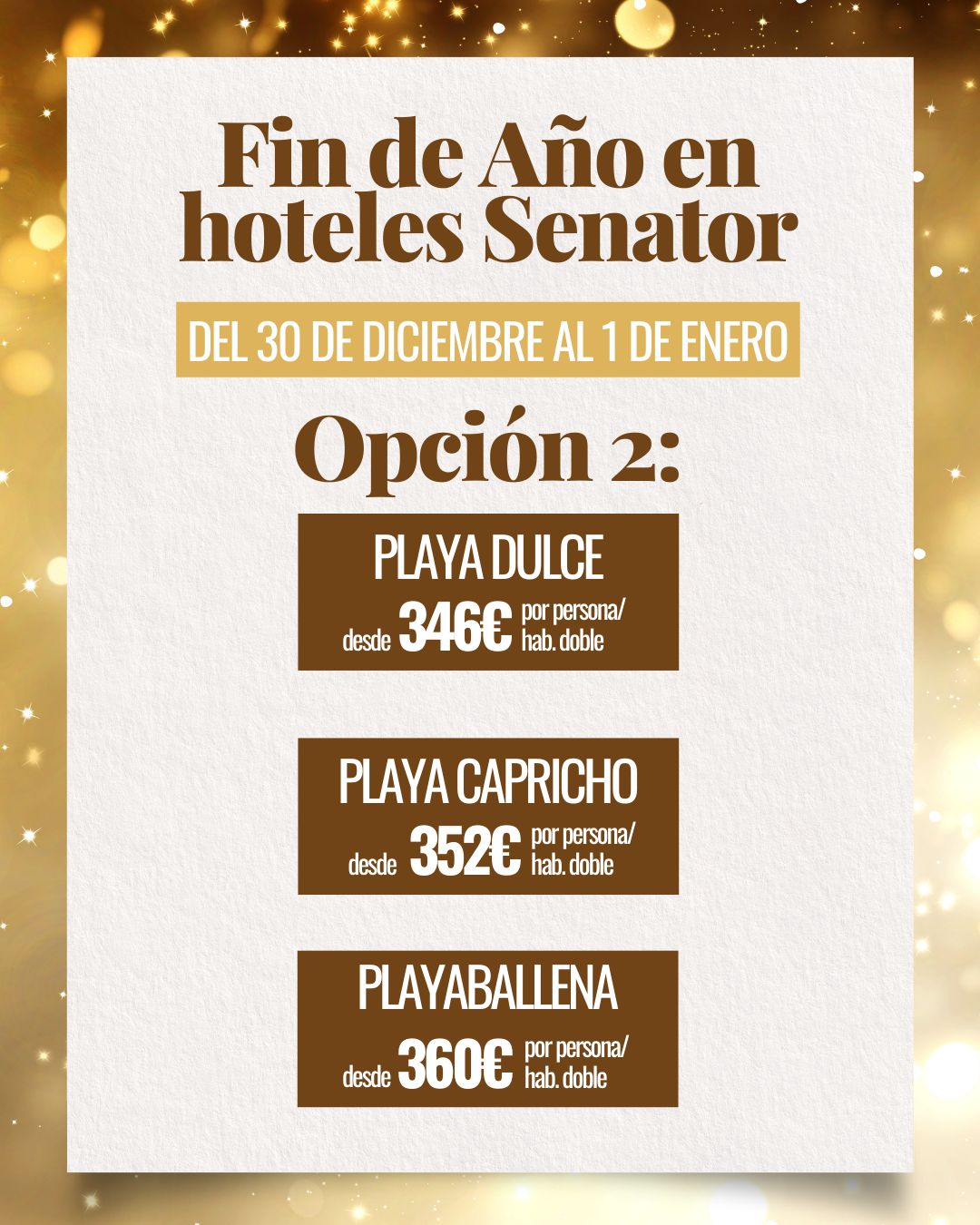 Celebrar el Fin de Año en los hoteles Playadulce, Playacapricho y Playaballena by Senator es una oportunidad perfecta para disfrutar unos días especiales en un ambiente cómodo, completo y pensado para todos. El paquete se realiza del 30 de diciembre al 1 de enero e incluye 3 días y 2 noches en habitación doble estándar, en régimen de alojamiento y desayuno. Los precios parten desde 346€ en Playadulce, 352€ en Playacapricho y 360€ en Playaballena, siempre sujetos a disponibilidad y variación según ocupación.