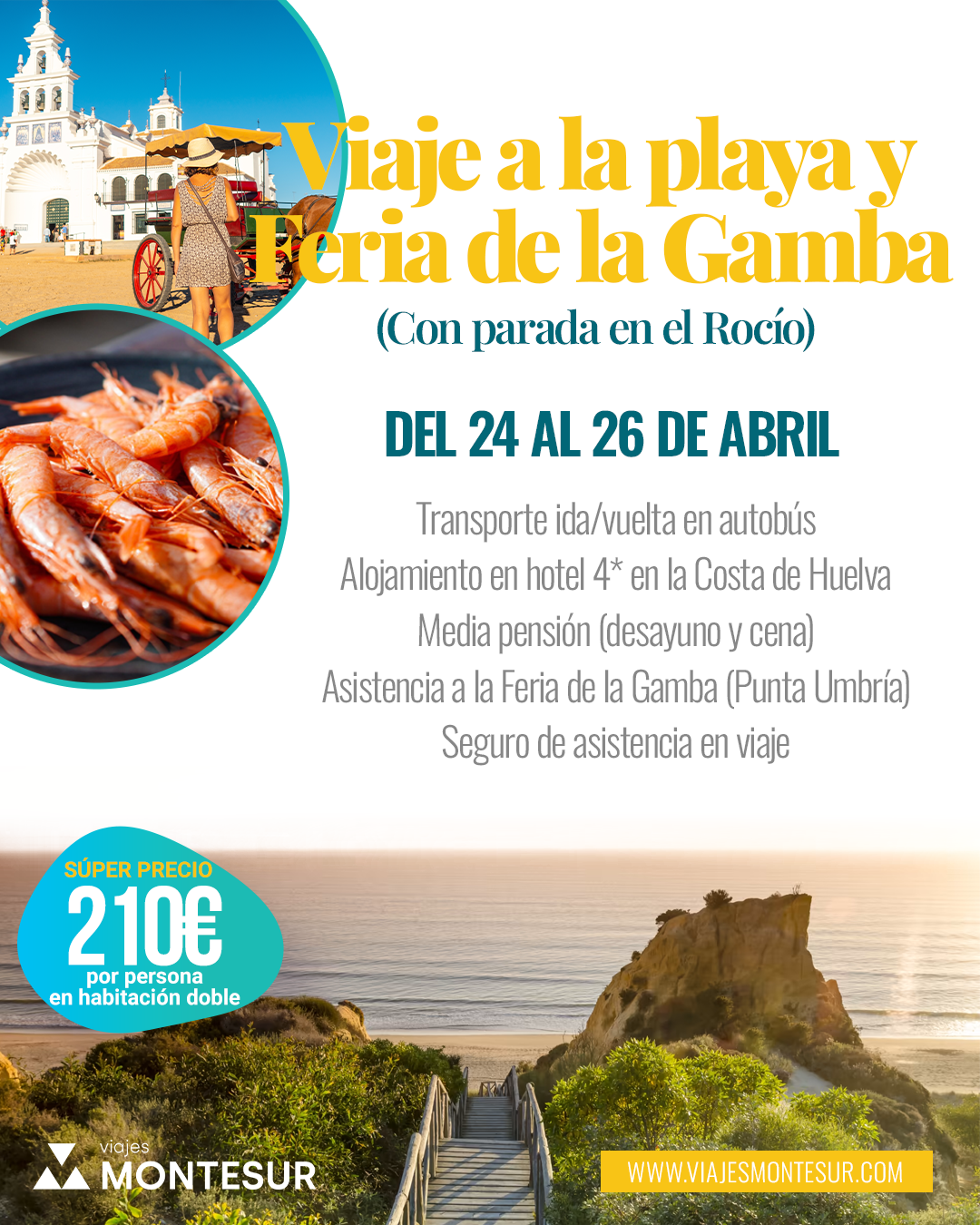 Disfruta de nuestro Viaje a la playa y a la Feria de la Gamba (con parada en El Rocío) del 24 al 26 de abril, una propuesta perfecta para combinar relax, tradición y gastronomía en la espectacular Costa de Huelva.